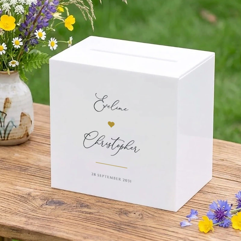 Een enveloppendoos is meer dan een praktisch hulpmiddel, het is een eyecatcher op de cadeautafel die gasten uitnodigt hun wensen achter te laten. Deze acryl enveloppendoos uit de Love Heart collectie combineert transparant wit acryl met jullie namen in sierlijk script en een gouden hartje. Strak, persoonlijk en onmiskenbaar van jullie.