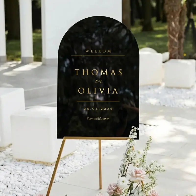 De unieke boogvorm geeft dit bord een zachte, organische maar toch moderne uitstraling. In combinatie met de spiegelende gouden belettering van namen en datum (zoals THOMAS en OLIVIA op de foto), ontstaat een visueel spektakel. De bedrukking is permanent en verkleurt niet, waardoor het bord een leven lang zijn schittering behoudt. Dit is de ultieme keuze voor bruidsparen die zoeken naar ‘Quiet Luxury’ met een ‘edge’.