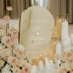 Een spiegelend gold mirror welkomstbord in boogvorm is niet iets wat gasten snel vergeten. Dit arch welkomstbord uit de Love Heart collectie combineert het warme glinsteren van gold mirror acryl met witte typografie in sierlijk script, een combinatie die bij kaarslicht, bloemendecoratie én daglicht altijd mooi staat.