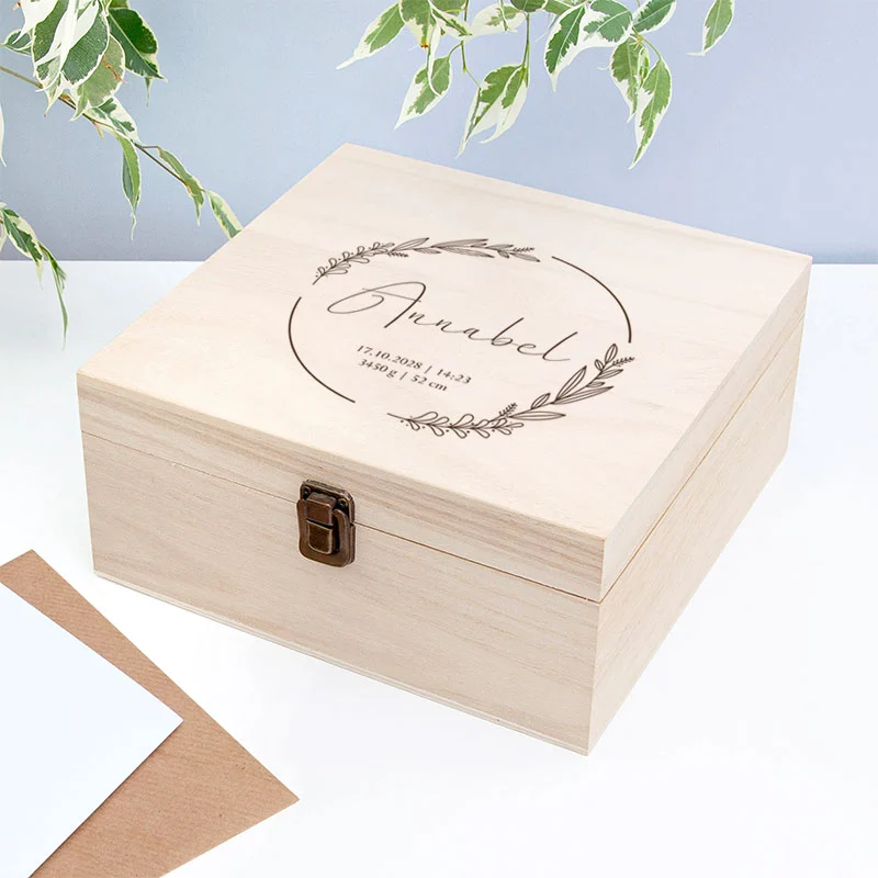 Stijlvolle houten keepsake box met elegante eucalyptus krans. De naam van je kleintje siert het midden in een modern script font, terwijl de geboortedetails in serif de herinnering aan die bijzondere dag vastleggen.