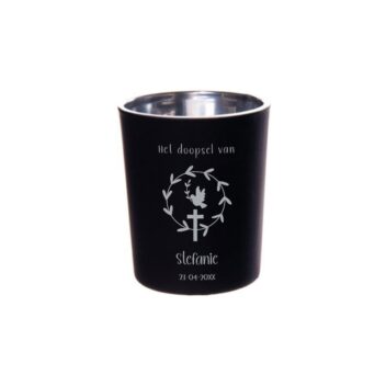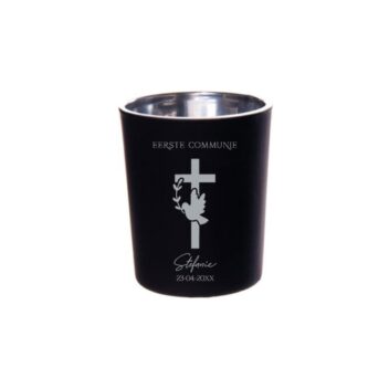 Vier de Communie of het Lentefeest met deze elegante, glazen waxinelichtjes. Ze zijn gegraveerd met een krans en duifje en worden gepersonaliseerd met de naam en datum van het kind. Dit stijlvolle bedankje (6 cm hoog) is verkrijgbaar in zwart of wit en is een blijvende herinnering aan een heilige gebeurtenis.