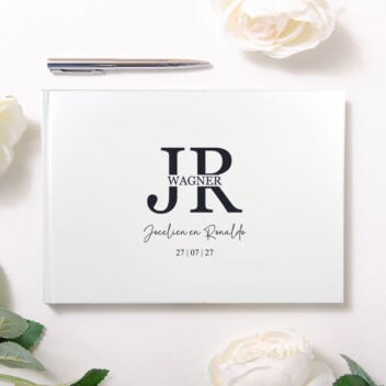 Gastenboek Modern Split Monogram | Gepersonaliseerd Geef jullie bruiloft een exclusieve en eigentijdse uitstraling met dit witte hardcover gastenboek. Het unieke split monogram ontwerp met jullie eigen initialen en achternaam vormt een stijlvol en krachtig middelpunt op de gastenboektafel.