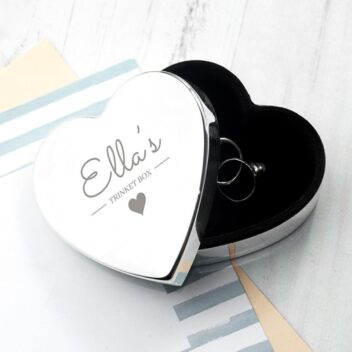 Hartvormige zilveren sieradendoos gepersonaliseerd met naam. Stijlvol en compact — een lief cadeau voor verjaardag, bruiloft of jubileum.