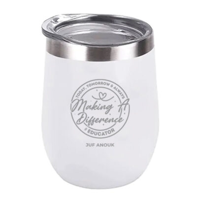 Een vacuumgeïsoleerde drinkbeker van roestvrij staal, gegraveerd met haar naam en de tekst “De liefste juf”. Praktisch, persoonlijk, en iets wat ze elke dag gebruikt, of ze nu ‘s ochtends een warme koffie meeneemt naar de klas of tussendoor een koud drankje inschenkt. Dit is het cadeautje voor de juf dat niet in een la verdwijnt maar mee gaat op elke schooldag.