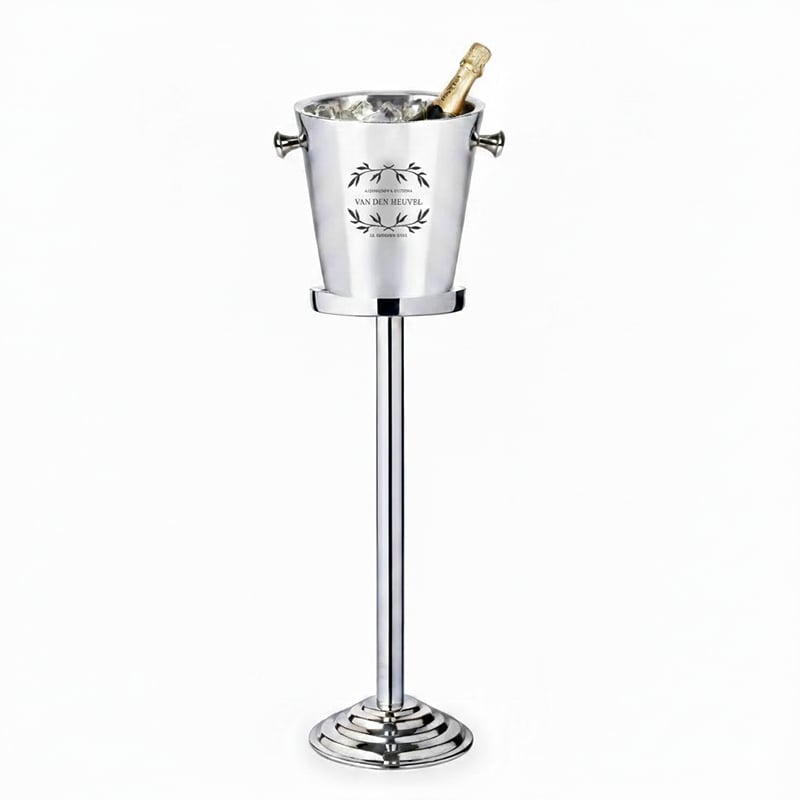 Voor de meest memorabele momenten van het leven presenteren wij de Royal Silver Edition. Deze prestigieuze champagnekoeler op standaard met naam is een statement van pure luxe en vakmanschap. Ontworpen voor de eerste toost van een bruidspaar of een officieel jubileumgala, brengt dit topstuk uit de Design Collectie 2026 de sfeer van een exclusief vijfsterrenhotel direct naar uw event. Voor een complete beleving combineert u deze koeler prachtig met onze gepersonaliseerde wijnglazen uit dezelfde serie.
