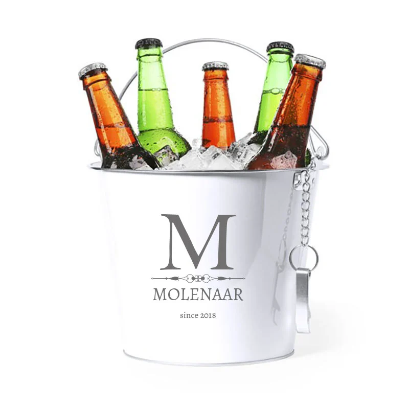 De ultieme koeler voor elke gastheer! Deze luxe metalen ijsemmer (6L) houdt je drankjes urenlang koud en wordt persoonlijk gegraveerd met monogram, naam en jaar. Inclusief bijpassende opener. Beschikbaar in wit en zwart. Hét pronkstuk voor elke bar en een uniek cadeau voor bruiloften of housewarmings.