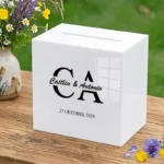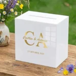 De geldbox is verkrijgbaar in wit en zwart, met vier printkleuren naar keuze. Van een klassieke zwart-wit combinatie tot een opvallende wit-goud uitstraling, de doos past altijd bij jullie bruiloftsthema.