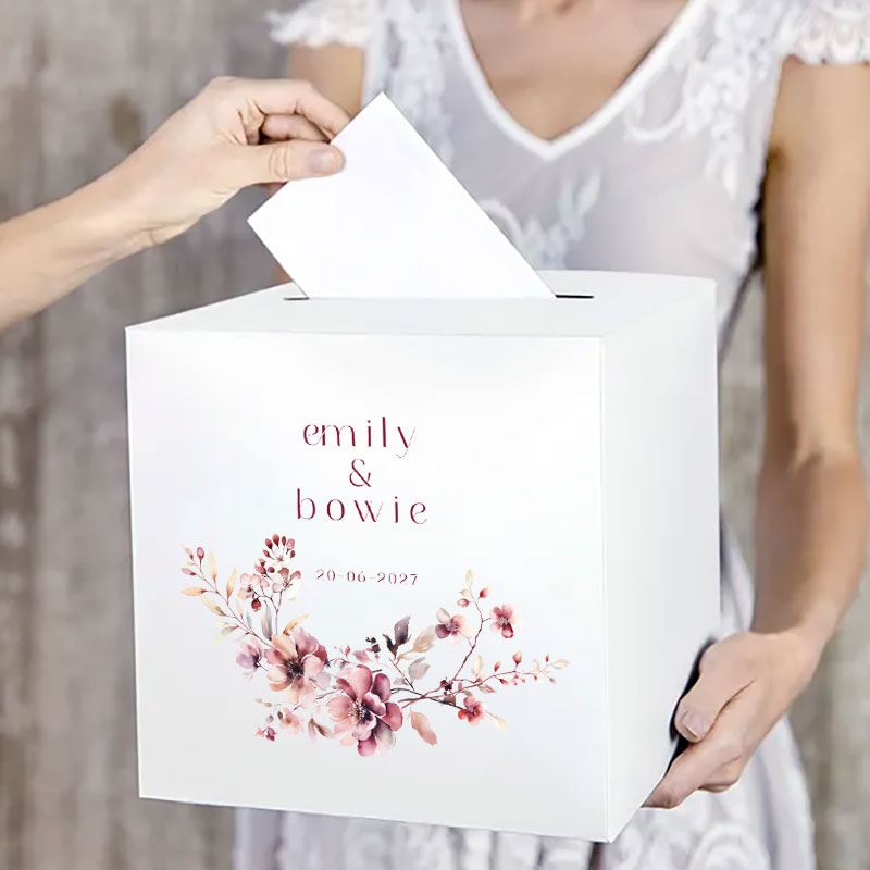 De Bordeaux & Blush cadeaubox is ontworpen voor bruidsparen die houden van diepe, warme bloementinten. De combinatie van het glanzende witte metallic karton en de gedetailleerde print van wildflowers geeft deze cadeaubox voor de bruiloft een premium uitstraling. Dankzij de gleuf aan de bovenzijde is de box niet alleen mooi, maar ook uiterst praktisch tijdens de receptie.