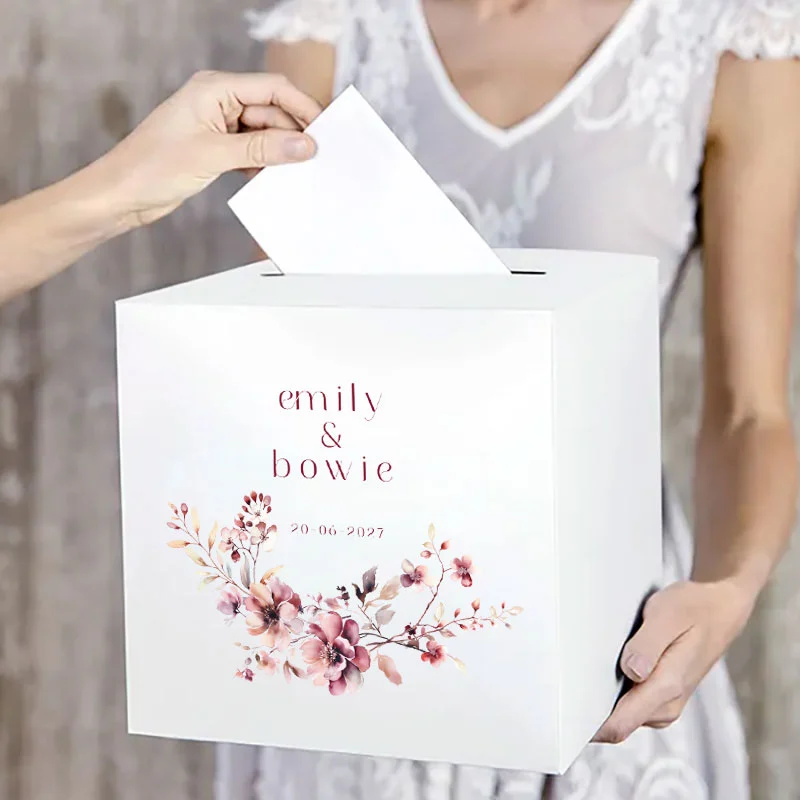 Een romantische enveloppendoos met weelderige aquarel bloemen in warme bordeauxrode en zachte blush tinten. Het elegante lettertype in bordeaux maakt het design helemaal af!