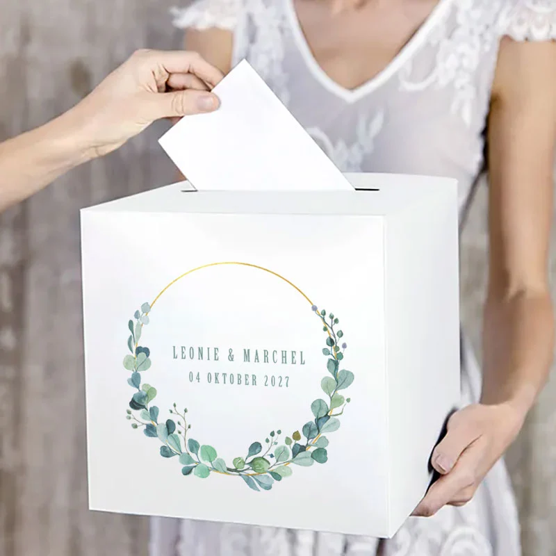 Een elegante plek voor alle kaarten en gelukwensen, met een tijdloos eucalyptus design en stijlvolle gouden accenten. De perfecte aanvulling op jullie bruiloftsdecoratie!