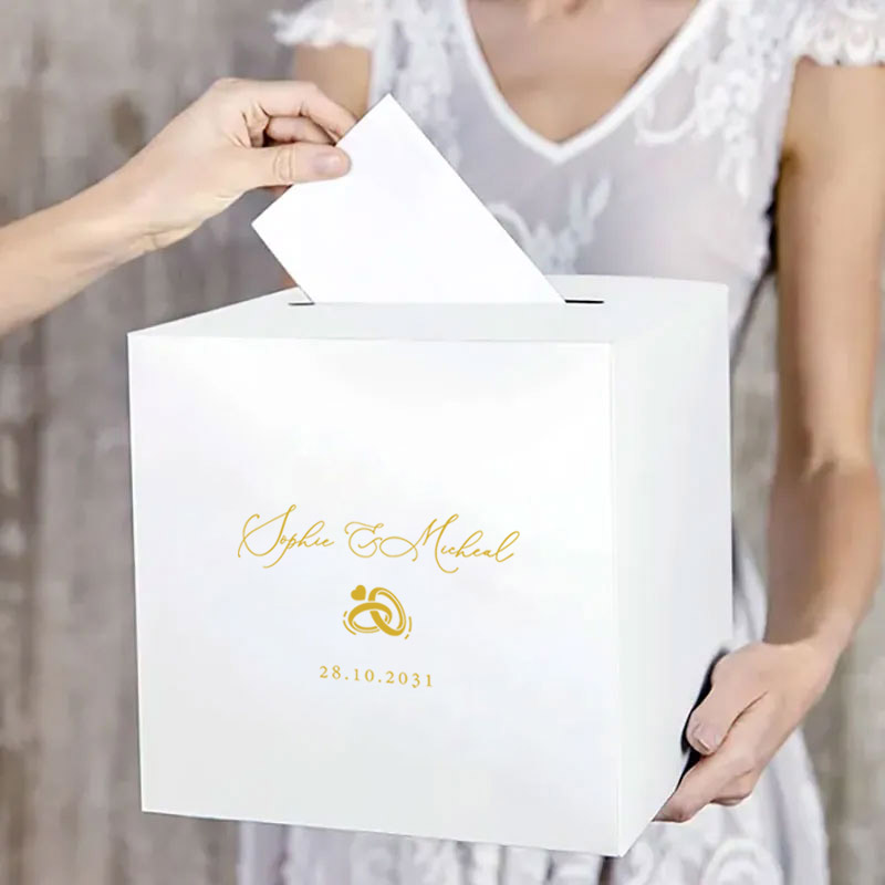 Houd jullie huwelijkskaarten en gelukswensen veilig en stijlvol bij elkaar met de Enveloppendoos Ringen Design. Deze prachtige witte metallic box met een elegant gouden ringenmotief vormt een luxe middelpunt op de cadeautafel. Een moderne eyecatcher die naadloos aansluit bij een romantische bruiloft.
