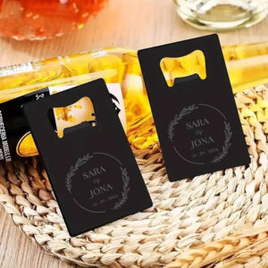RVS flesopener bedankje met elegante bloemenkrans rondom jullie namen en datum. Verkrijgbaar in zilver en zwart. Compact, duurzaam en persoonlijk. Minimaal 24 stuks, binnen 3-5 werkdagen verzendklaar.
