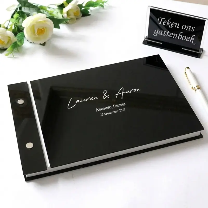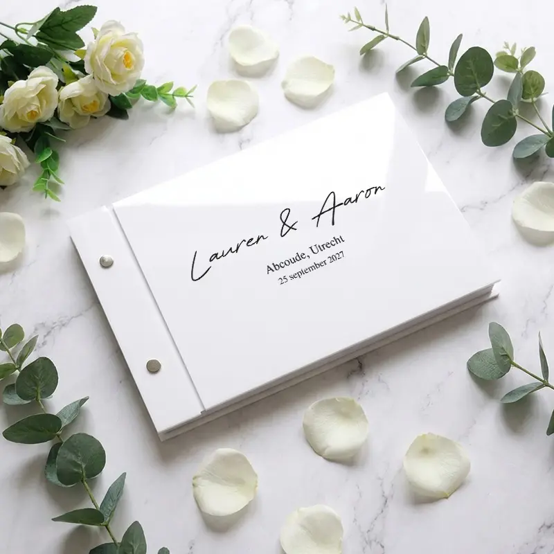 De kaft is verkrijgbaar in wit, zwart en goud mirror acryl. De printkleur kies je uit wit, zwart, goud of antraciet, zodat je de combinatie volledig kunt afstemmen op jullie bruiloftsthema.