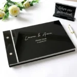 Dit acryl gasten boek met signature design heeft een helder, minimalistisch uiterlijk. Jullie namen staan centraal in een sierlijk handgeschreven lettertype, aangevuld met de trouwdatum en optioneel de locatie. Geen drukke motieven, maar een clean look die past bij elk trouwthema.