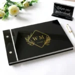 Dit acryl gastenboek met diamant monogram design geeft de receptietafel een elegante uitstraling. Jullie initialen staan centraal in een sierlijke ruit met botanische details, aangevuld met namen en datum. Het resultaat is een gastenboek dat na de bruiloft een blijvend aandenken is.