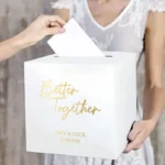 Geef jullie cadeautafel een romantische uitstraling met de Better Together Enveloppendoos. Deze luxe box van hoogwaardig glanzend wit karton wordt gepersonaliseerd met jullie namen en trouwdatum. Met een keuze uit 30 verschillende drukkleuren matcht deze box perfect bij jullie bruiloftsthema.
