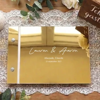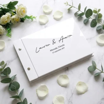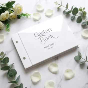 Controleer namen en datum zorgvuldig voor je de bestelling afrond. Bij gepersonaliseerde producten zijn wijzigingen na bevestiging niet altijd mogelijk, zeker niet bij gravure of acrylbedrukking. Een gepersonaliseerd gastenboek bruiloft met jullie namen op de omslag maakt het gastenboek denk meteen herkenbaar op de receptietafel.
