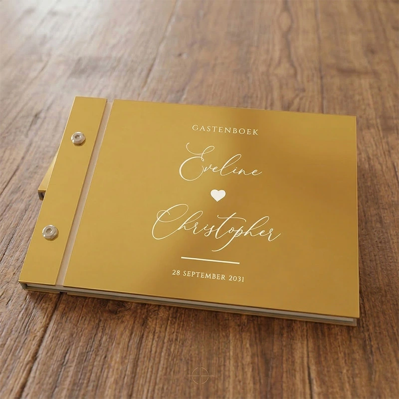 Het verschil zit in de cover. De gold mirror versie heeft een spiegelend goudkleurig acryl met witte bedrukking, feestelijk en opvallend. De witte variant heeft een strakke witte achtergrond met gouden details, ingetogen en tijdloos. Het binnenwerk, formaat en de personalisatieopties zijn bij beide identiek.
