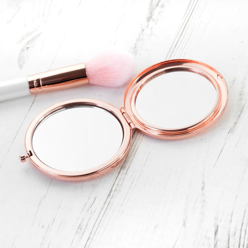 Laat onze gespecialiseerde kunstenaars de naam en persoonlijke boodschap graveren op zijn of haar eigen make up spiegeltje, die dankzij de grootte van slechts 7 bij 8 cm in elke handtas past – waardoor hij gemakkelijk overal mee naartoe kan worden genomen!