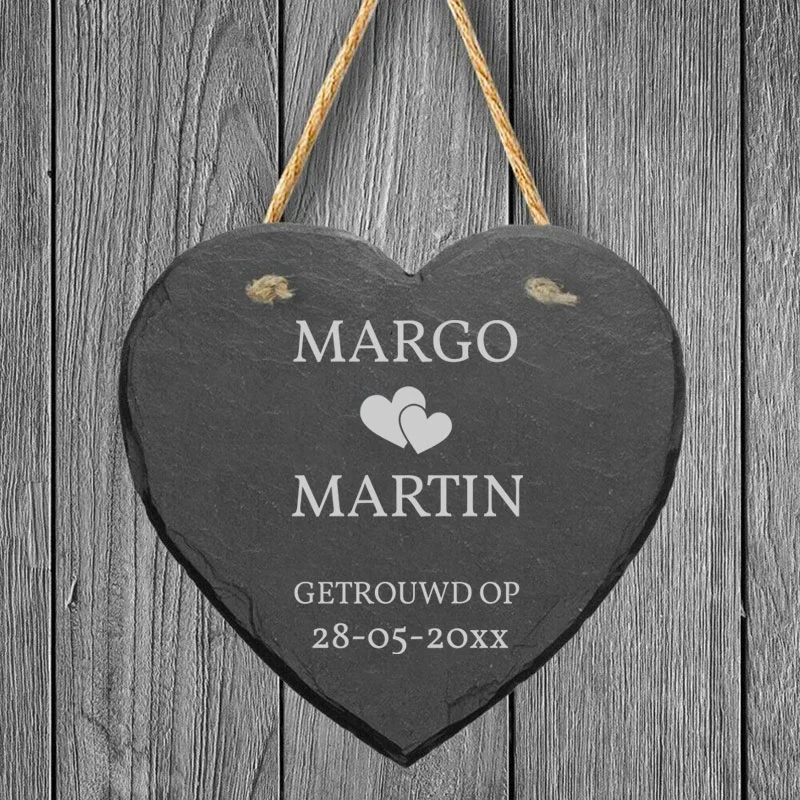 Geef een cadeau dat de liefde viert. Bestel nu ons Hartvormig Gepersonaliseerd Leisteen Ophangbord voor €24,95 en personaliseer het met namen, datum en je eigen boodschap!