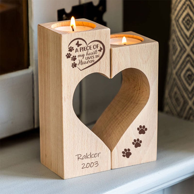 Ben je op zoek naar een betekenisvol en troostend cadeau om de herinnering aan een geliefd huisdier levend te houden? Onze Hemelse Herinnering Huisdier Kaarshouder Set is precies wat je nodig hebt. Deze prachtige set van twee kaarshouders, gemaakt van hoogwaardig beukenhout, vormt samen een hart en is gegraveerd met de tekst “A piece of my heart lives in heaven” in een hart. Er is ruimte voor het toevoegen van een naam en jaartal, en de set bevat drie gegraveerde pootafdrukken, waardoor het een persoonlijk en onvergetelijk eerbetoon wordt aan je trouwe viervoeter.