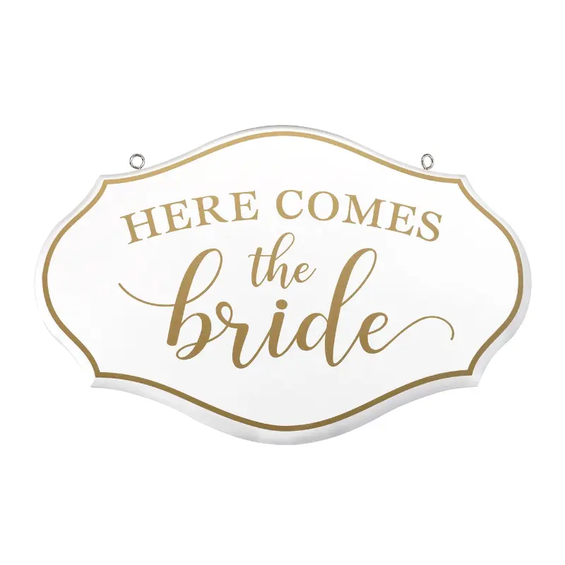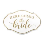 Dit witte bordje met gouden tekst en rand is een leuke manier om een bloemenmeisje of ringdrager een eigen rol te geven tijdens de ceremonie. In plaats van de traditionele mand of kussen draagt het kind dit bordje met de tekst “Here Comes the Bride” terwijl de bruid de zaal binnenkomt. Het resultaat is een speels moment dat bij iedereen een glimlach oproept.