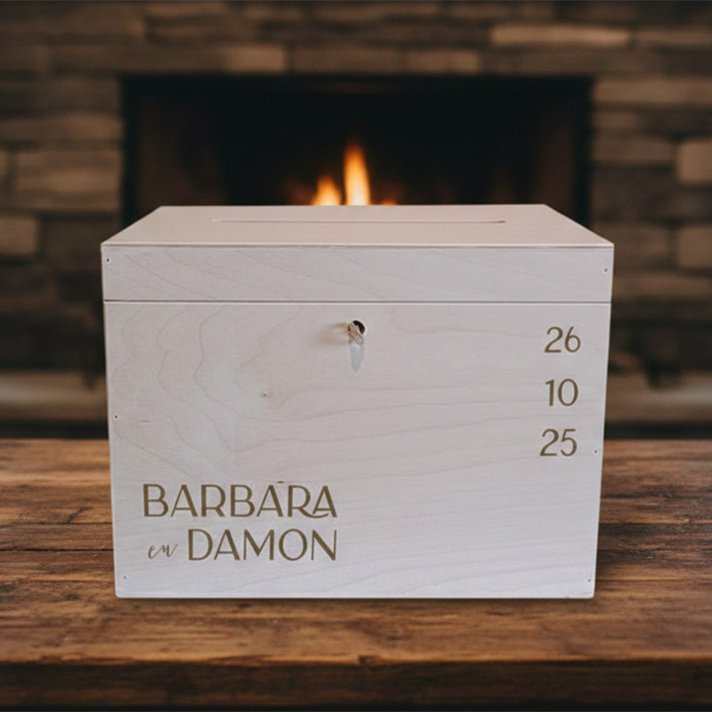 De doos is vervaardigd uit FSC-gecertificeerd berkenmultiplex en haarscherp lasergegraveerd in eigen atelier. Het goudkleurige slot met sleutel zorgt ervoor dat alle enveloppen en gelukswensen veilig opgeborgen blijven tijdens de receptie.
