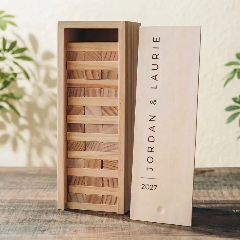 De meeste gastenboeken verdwijnen in een la. Dit niet. Met deze gepersonaliseerde Jenga set schrijven gasten hun wens op een houten blokje, en elke keer dat jullie het spel spelen pakken jullie die herinneringen er letterlijk weer uit. Een gastenboek dat leeft, lang na de bruiloft.