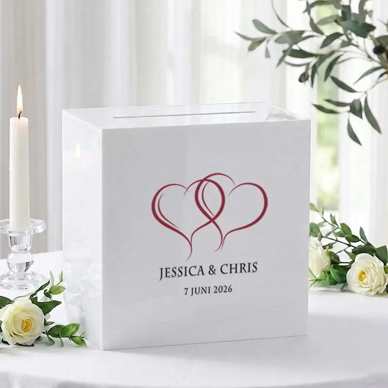 De kaartenbox wordt gepersonaliseerd met jullie namen en trouwdatum. Je geeft deze gegevens op tijdens het bestelproces.