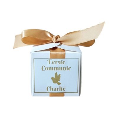 Gepersonaliseerde Snoepdoosjes Communie Goud – het perfecte bedankje voor een onvergetelijke communie of lentefeest! In een schattig formaat van 6x6x6