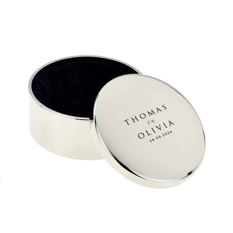 Bij Gifts & Weddings weten we dat een trouwringendoosje een blijvende herinnering is. Daarom gebruiken we voor de Laurie een modern, strak lettertype dat haarscherp in het metaal wordt gezet. Dankzij onze jarenlange ervaring met UV-gravures in eigen studio, bent u verzekerd van een resultaat dat krasvast is en zijn verzilverde glans behoudt, zonder dat poetsen nodig is.