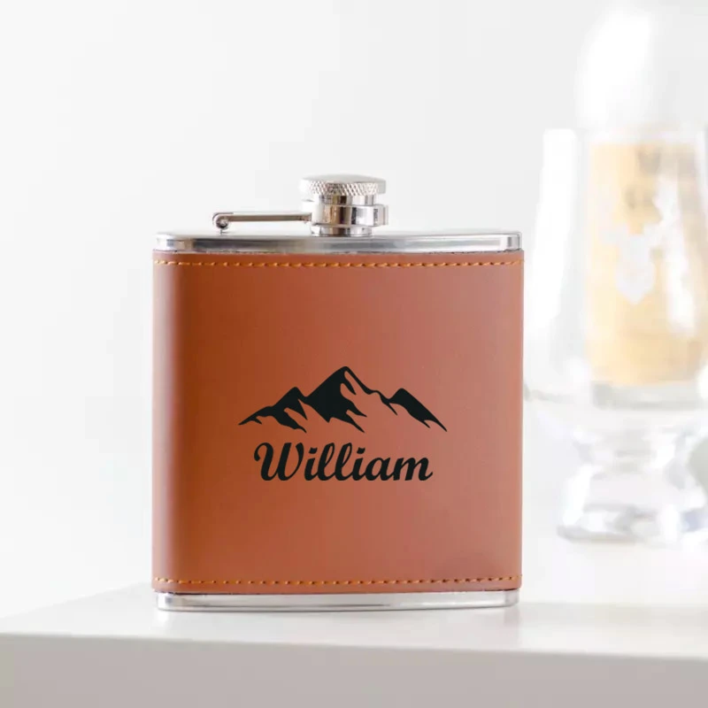 Voor de avonturier in je leven! Deze Leren Heupfles (150 ml) is de ideale metgezel voor outdoor liefhebbers. De fles is verkrijgbaar in zwart of bruin echt leer en wordt gegraveerd met een Naam naar keuze, plus één van de 12 stijlvolle designs. Gemaakt van Roestvrij Staal en duurzaam omhulsel.