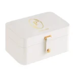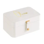 Stijlvolle opbergruimte met een gouden randje Geef je kaptafel een upgrade met deze witte sieradenbox, die functionaliteit combineert met een minimalistische Korean style esthetiek. Omdat wij geloven in kwaliteit boven kwantiteit, bieden wij dit doosje uitsluitend aan met een goudkleurige personalisatie. Goud biedt het mooiste contrast op het witte PU-leer en zorgt voor die tijdloze, luxe uitstraling waar je naar op zoek bent.