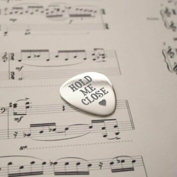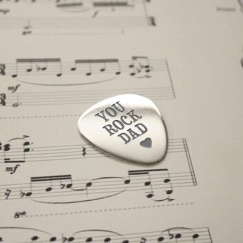 Gepersonaliseerd zilver stalen plectrum met eigen gravure - van romantisch tot grappig. Kies een voorbedrukt design of voer zelf drie regels tekst in. Gepresenteerd in een zwarte geschenkdoos.