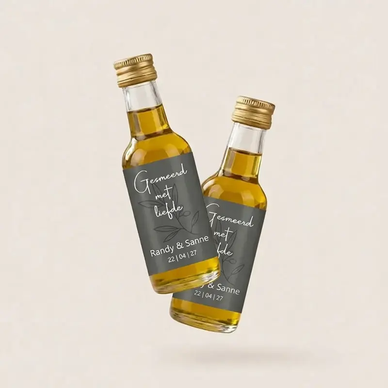 Een origineel en smaakvol bruiloft bedankje dat je gasten echt gebruiken. De Gesmeerd met Liefde olijfolie flesjes combineren een stijlvol antraciet vinyl etiket met een subtiele olijftak illustratie en jullie namen en datum in wit script. Praktisch, persoonlijk en onvergetelijk.