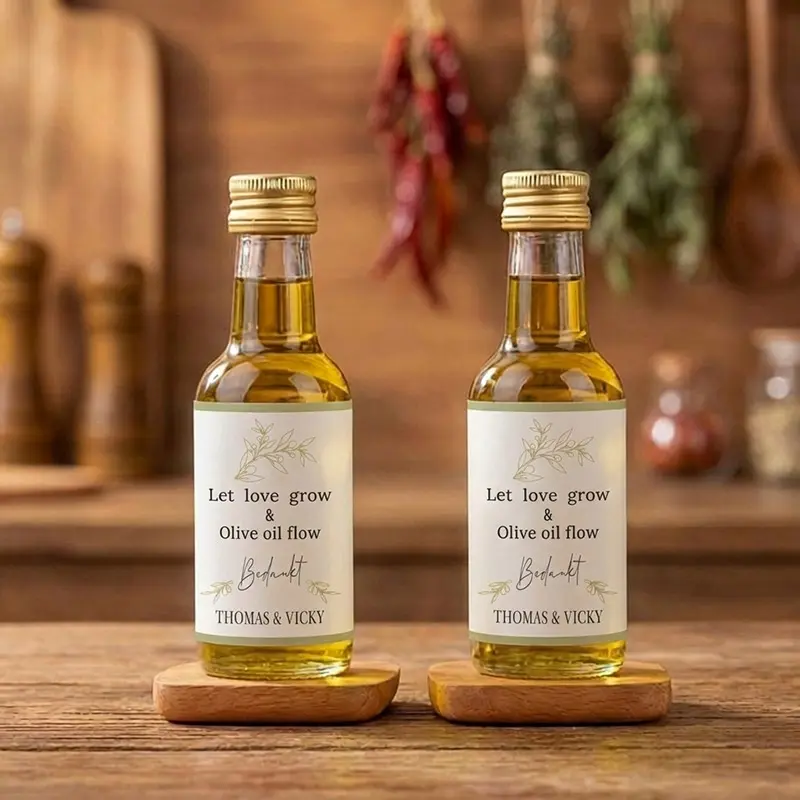 Een licht en botanisch olijfolie bedankje voor stellen die kiezen voor een natuurlijke en elegante uitstraling. Het Let Love Grow & Olive Oil Flow design combineert een wit etiket met gouden olijftak illustraties en jullie namen, subtiel, stijlvol en persoonlijk.