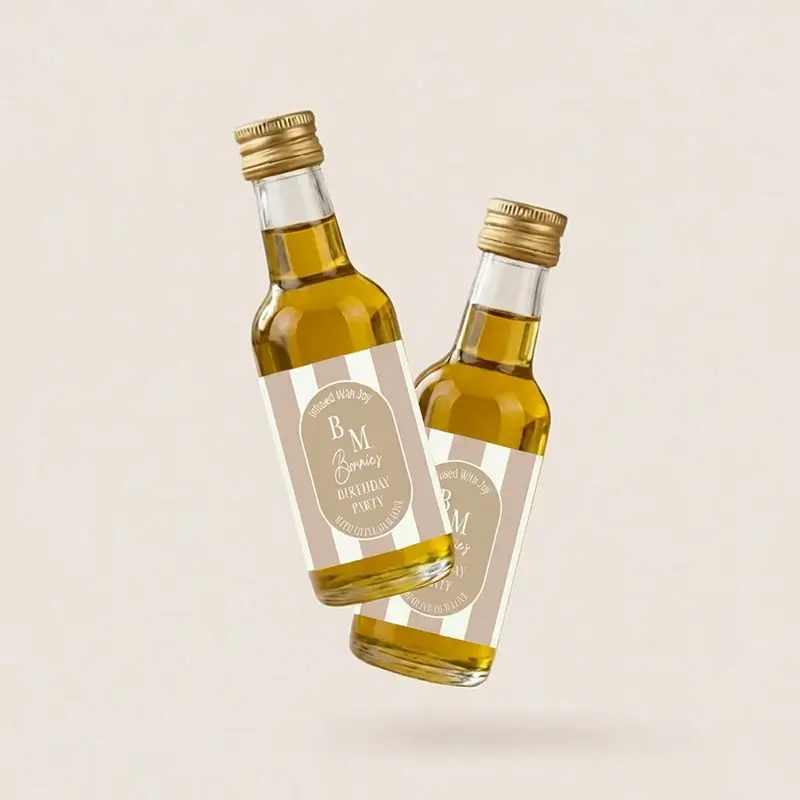 Een origineel en smaakvol verjaardag bedankje dat gasten echt gebruiken. Het Infused With Joy design combineert een zacht beige streep etiket met een elegante ovale badge, initialen en naam, UV gedrukt voor rijke details en een luxe afwerking.
