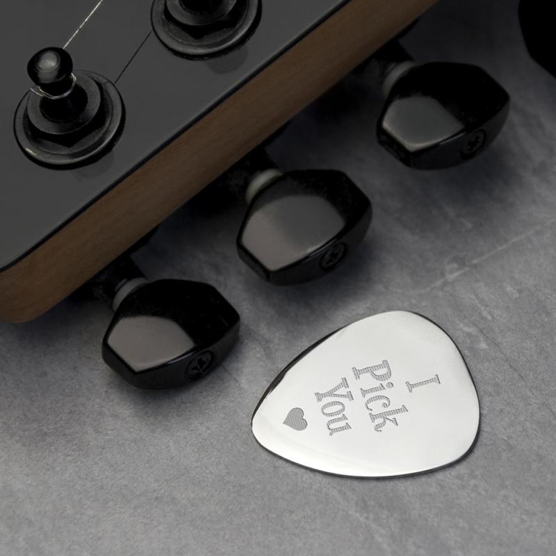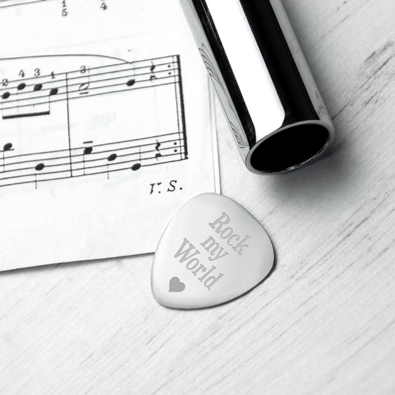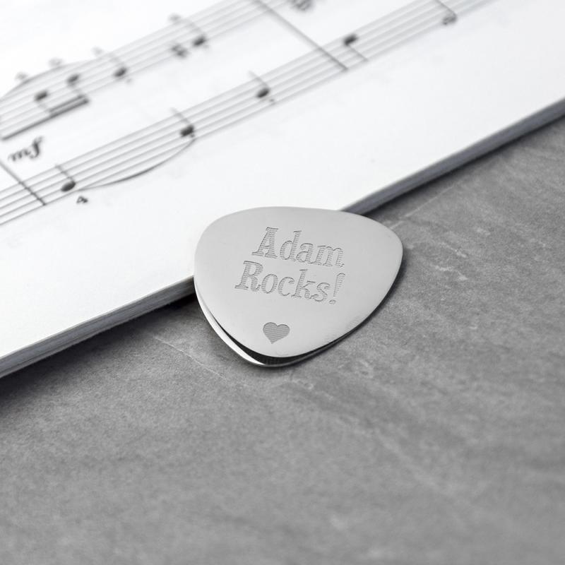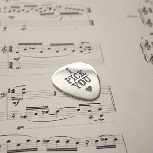 Gepersonaliseerd zilver stalen plectrum met eigen gravure – van romantisch tot grappig. Kies een voorbedrukt design of voer zelf drie regels tekst in. Gepresenteerd in een zwarte geschenkdoos.