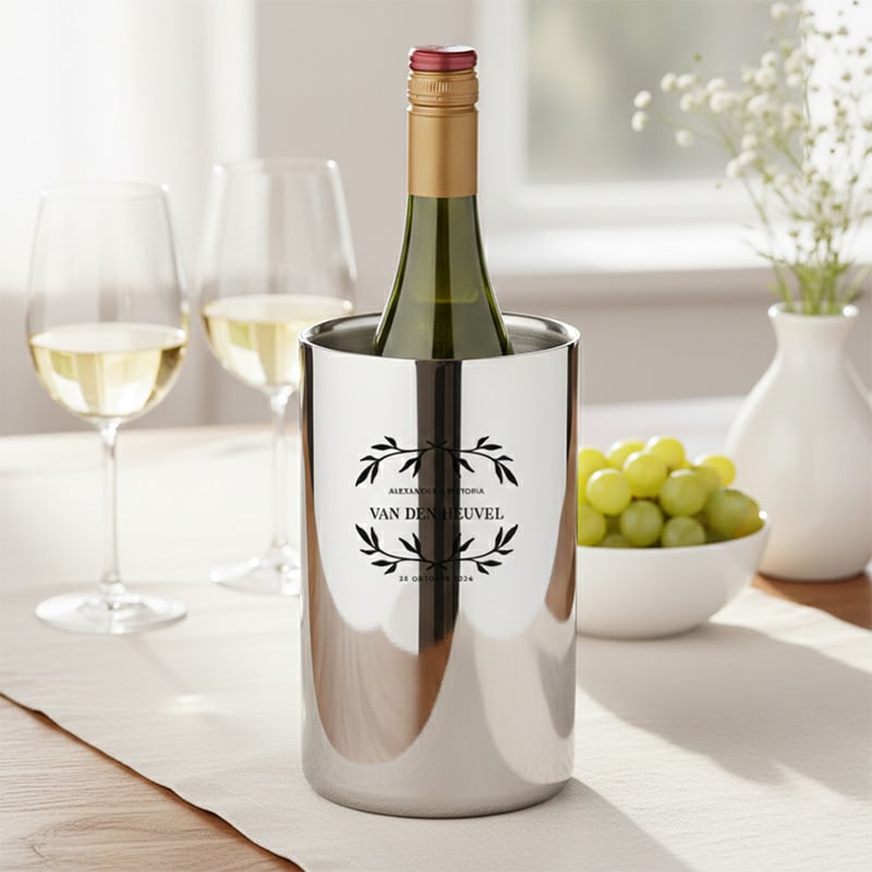 De RVS flessenkoeler met naam uit onze Pure Steel Edition is de perfecte keuze voor wie houdt van een klassieke en prestigieuze uitstraling. Vervaardigd uit hoogwaardig gepolijst edelstaal, fungeert deze koeler als een spiegelend middelpunt op elke feestelijk gedekte tafel. Of het nu gaat om een intiem diner of een groots huwelijksfeest, deze koeler uit de Design Collectie 2026 staat garant voor een presentatie op sterrenniveau.