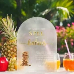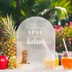 Het bordje is verkrijgbaar in zwart, wit en frosted acryl en past daarmee bij vrijwel elke bruiloftsstyling. De boogvorm geeft het een moderne, decoratieve uitstraling die ook na de bruiloft mooi staat.