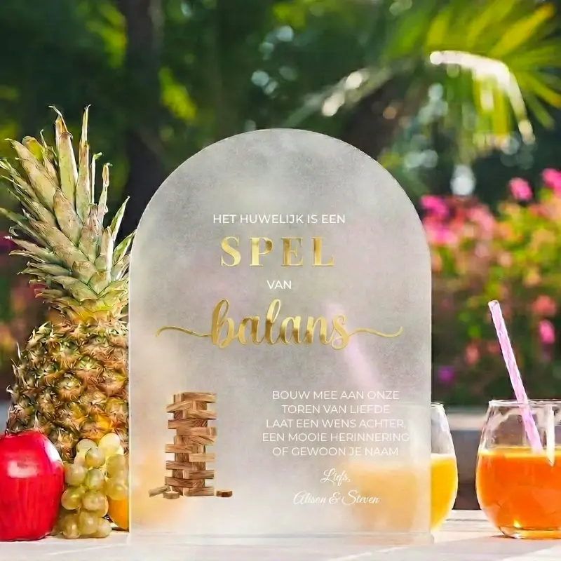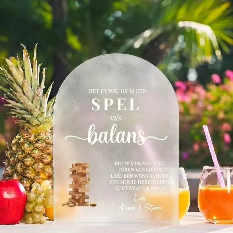 Dit acryl tafelbordje is de ideale aanvulling op het Jenga gastenboek. Het bordje staat op de receptietafel en nodigt gasten uit om een blokje te pakken, een wens achter te laten en mee te bouwen aan jullie toren van liefde. De vaste tekst op het bordje legt in één oogopslag uit hoe het werkt, aangevuld met jullie namen onderaan.