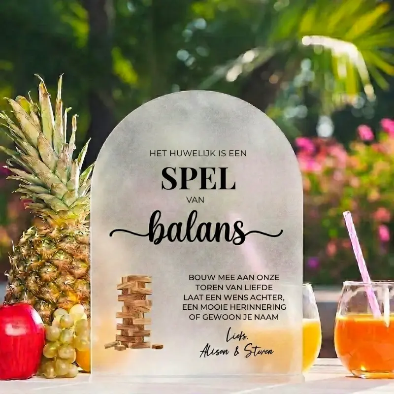 “Het huwelijk is een spel van balans. Bouw mee aan onze toren van liefde, laat een wens achter, een mooie herinnering of gewoon je naam. Liefs,”