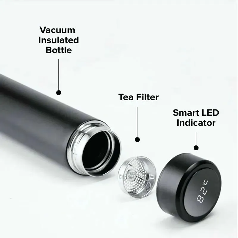 Het display toont automatisch de temperatuur zodra je het deksel oppakt. Geen batterijen nodig, het display werkt op de warmte van de vloeistof.