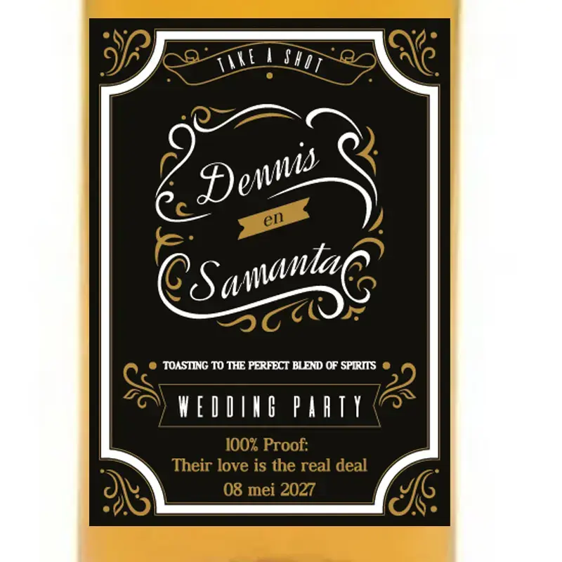 Geef een stoer en persoonlijk accent aan je bruiloft met onze 50ml “Vintage Distillery” whisky flesjes. Deze kristalheldere, food-grade PET-flesjes zijn breukvast en worden geleverd met een luxe aluminium schroefdop voor een lekvrije afsluiting. Het hoogtepunt is het gepersonaliseerde vinyl label, dat wij bedrukken met jullie eigen namen en trouwdatum voor een authentieke uitstraling.